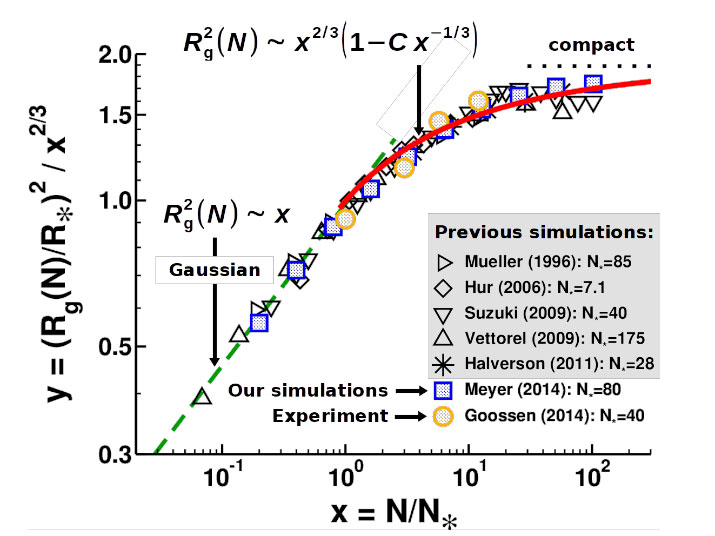 Figure 2. Radius of gyration R g versus N for unconcatenated ring polymers in a melt. The abscissa is scaled by N* ˜ N e and the ordinate such that compact behavior gives a horizontal line. Previous simulation results and experimental data are compared with our simulations. The solid line shows the prediction from the decorated loop model. Figure adapted from [7].