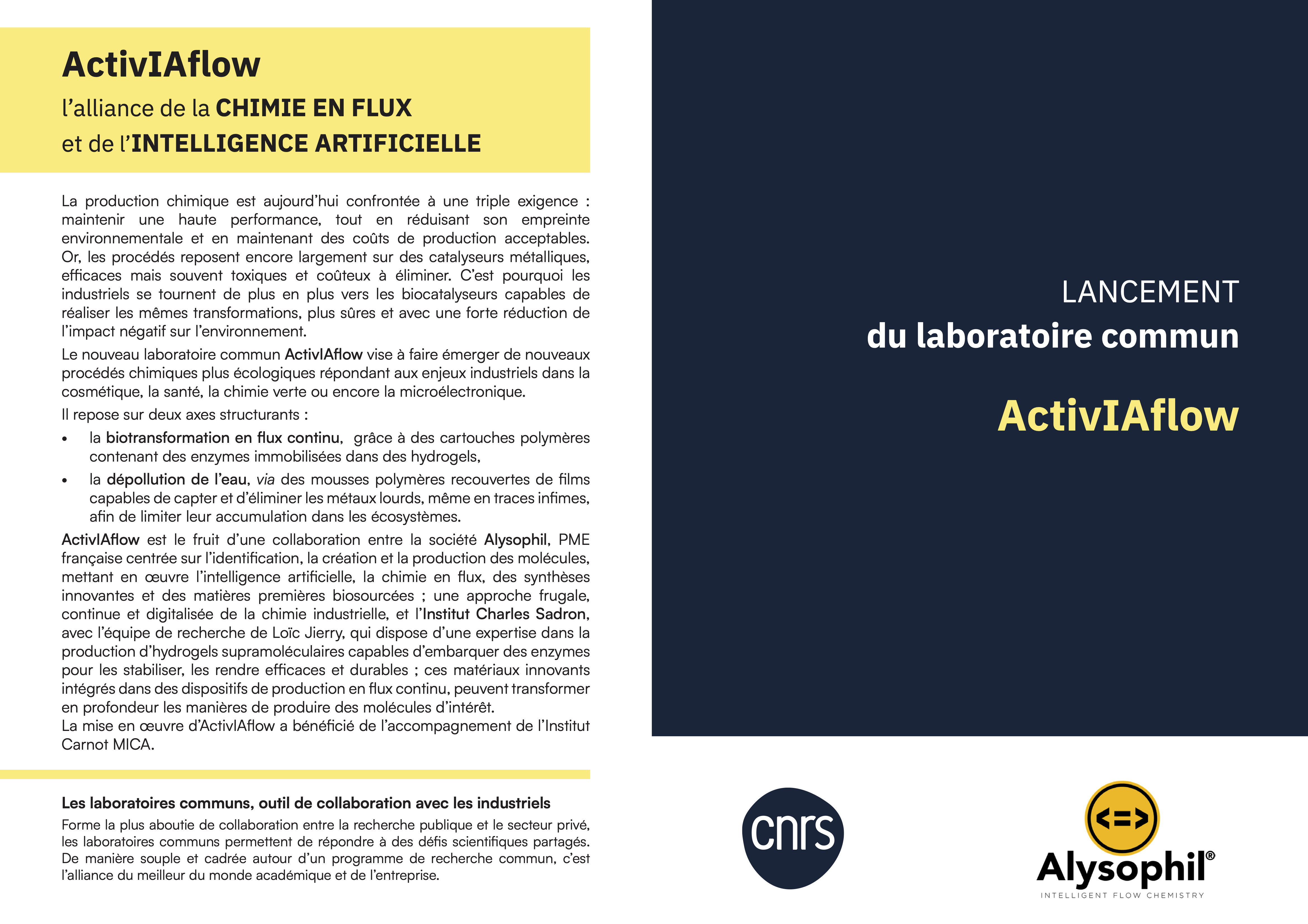 A joint laboratory, or LabCom', is a space for exchange in the form of a collaborative space made available to both parties.  Located at the Charles Sadron Institute (UPR 22), ActivIAflow aims to bring industry and academic research closer together.  The goal is to revolutionize flow chemistry by integrating artificial intelligence.  Two areas of research are being prioritized: (1) the use of enzymes trapped in polymer foams and (2) the modification of these foams for the decontamination of trace amounts of heavy metals.